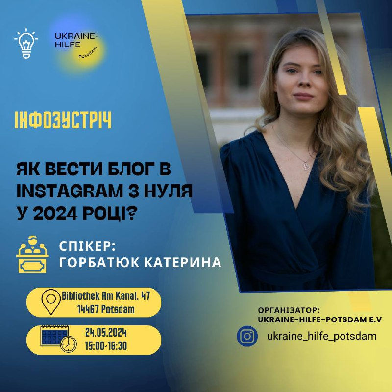 Ukraine-Hilfe Potsdam e.V.  запрошує на інформаційну  зустріч:  «Як вести блог в Instagram з нуля у 2024 році?»